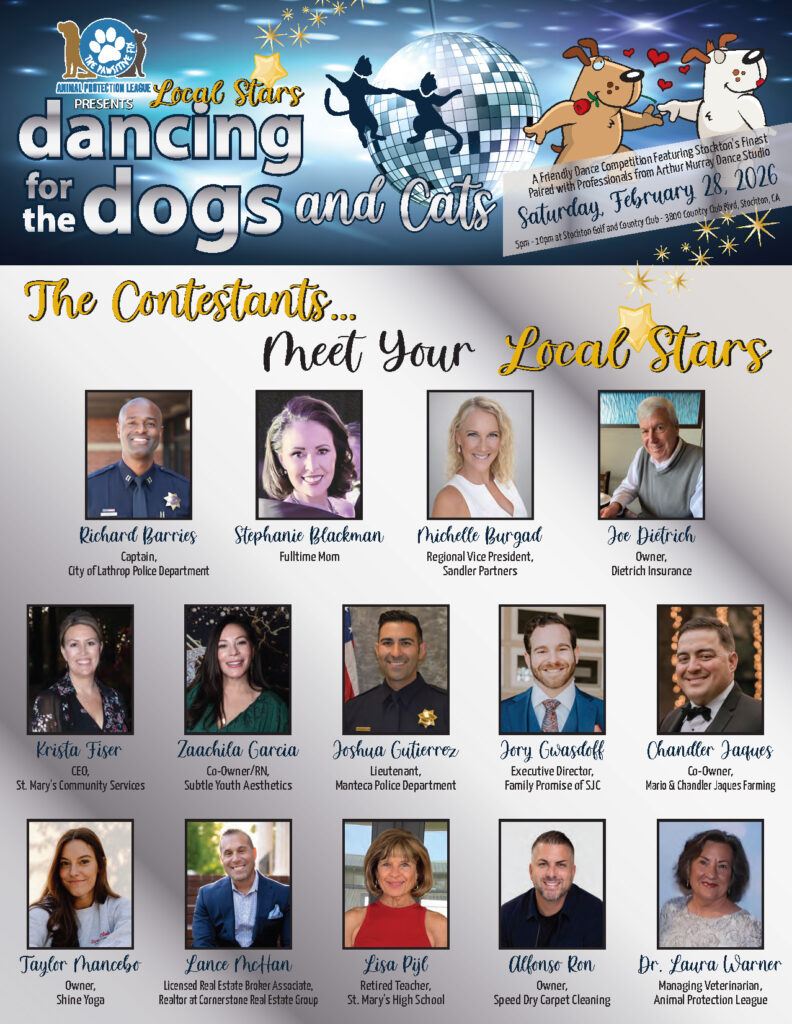 Mark your calendars for Saturday, February 28, 2026 as we host our much-anticipated annual event – “Local Stars Dancing for the Dogs and Cats.” This unforgettable evening will feature prominent members of our community paired with professional dancers from Arthur Murray Dance Studio for an exciting competition. Get ready for a magical night as they don their dancing shoes and light up the stage!
